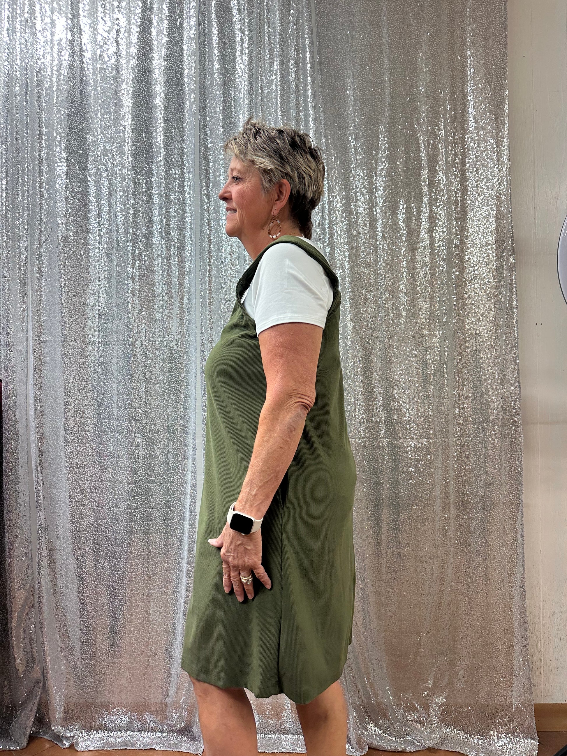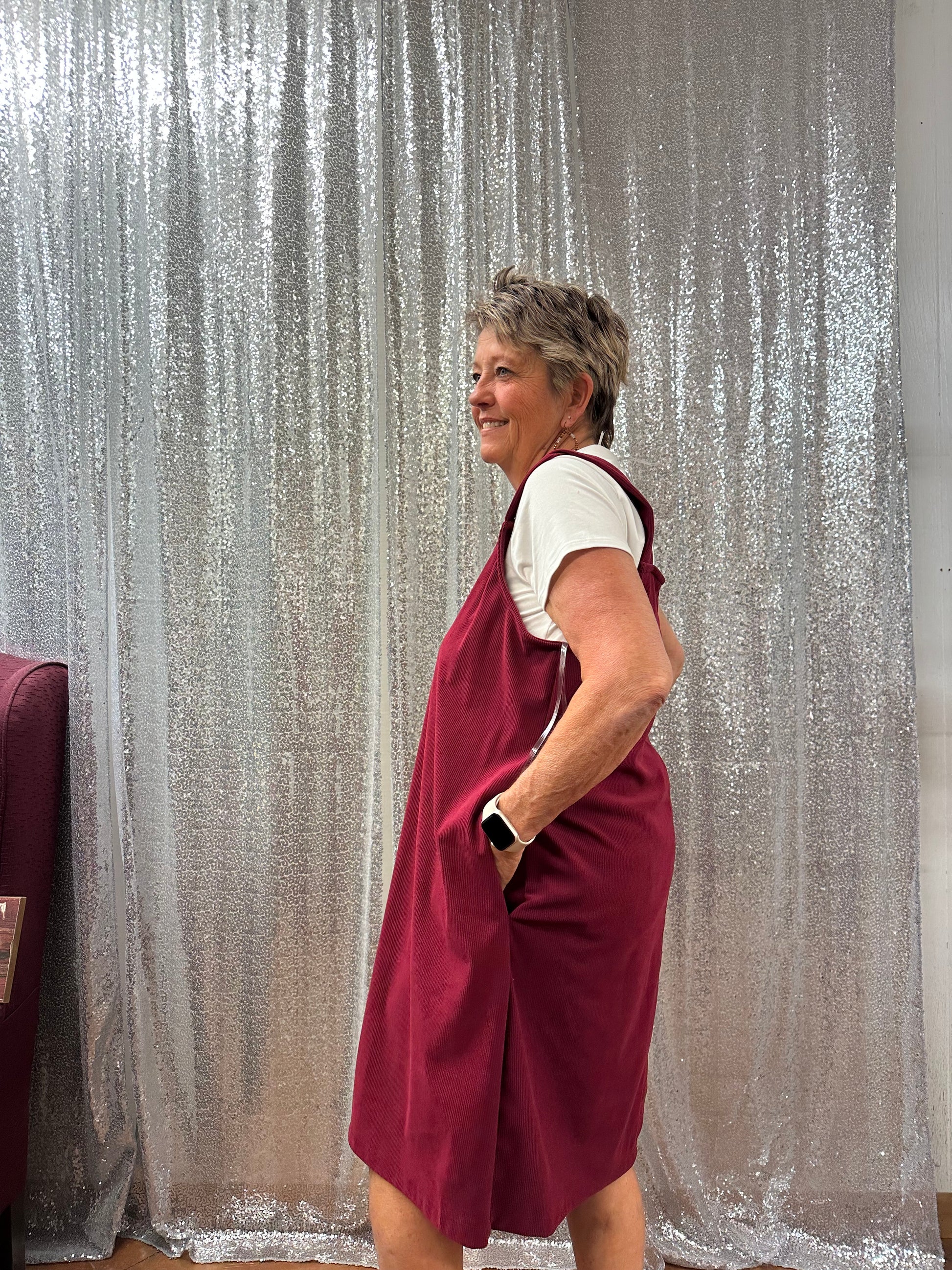 corduroy sleeveless V-neck dress great for layering. Retro, warm, and feminine.
