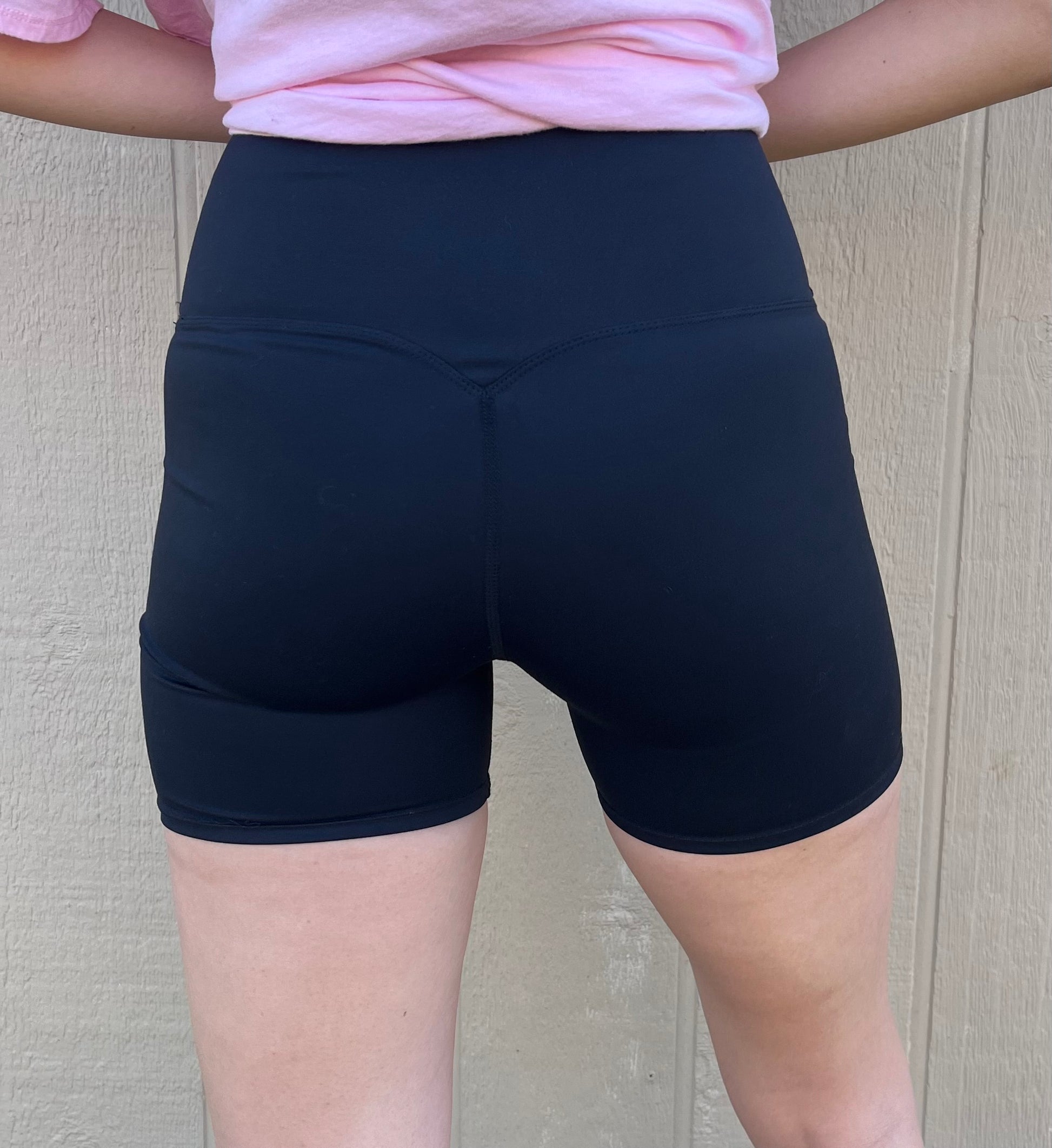 No front seam, V back-super flattering! Compressive waistband to cinch in the waist and keep you secure. Soft and stretchy material. Runs small, size up one size! 6” inseam
