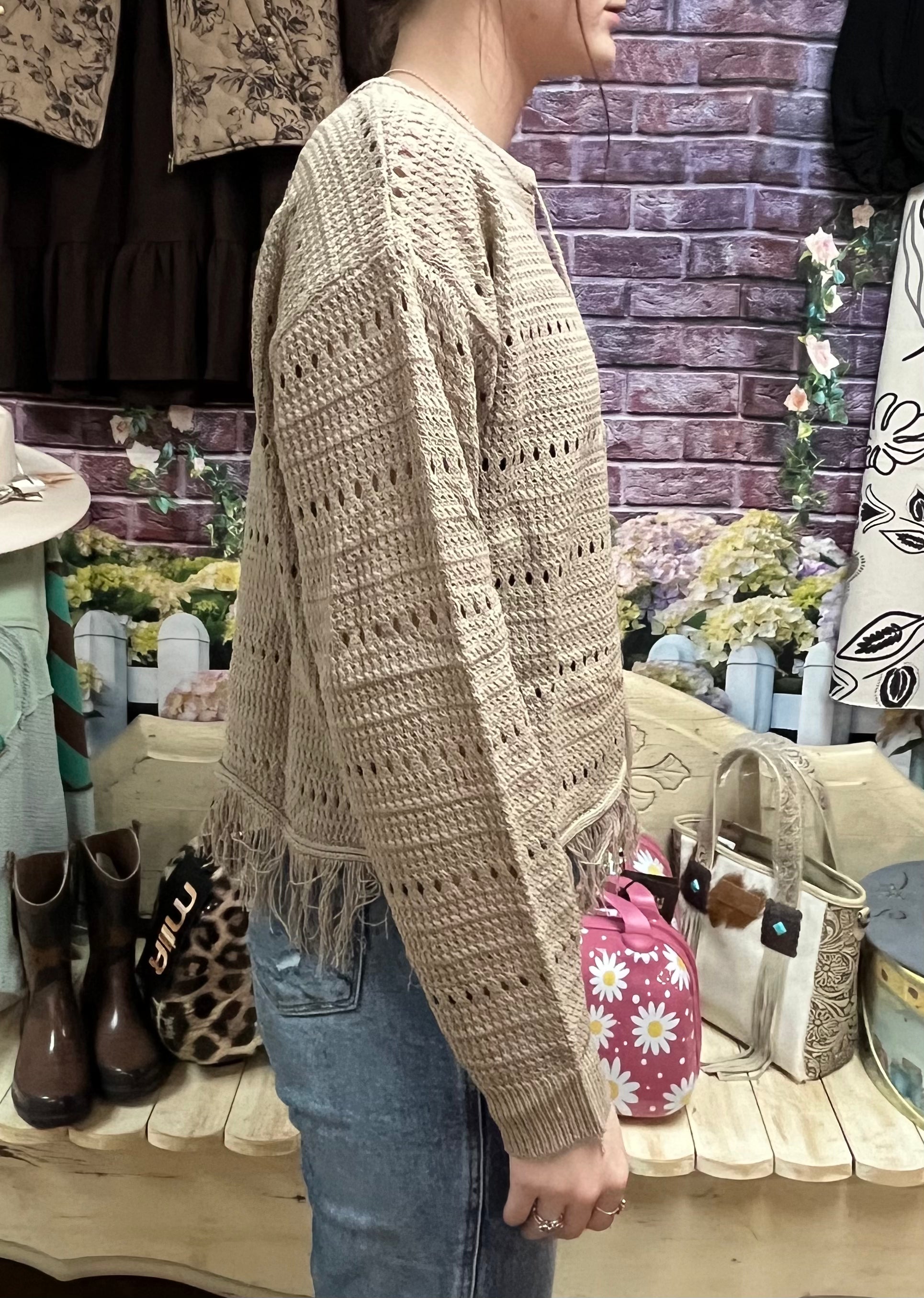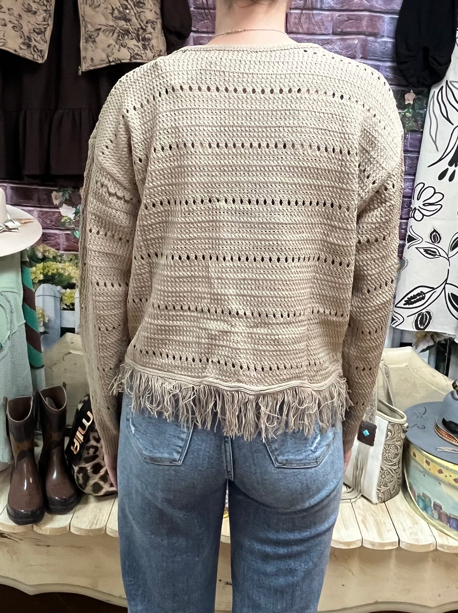 Crochet long sleeve-has holes so it is recommended to wear a cami or something underneath! 60% polyester 40% acrylic