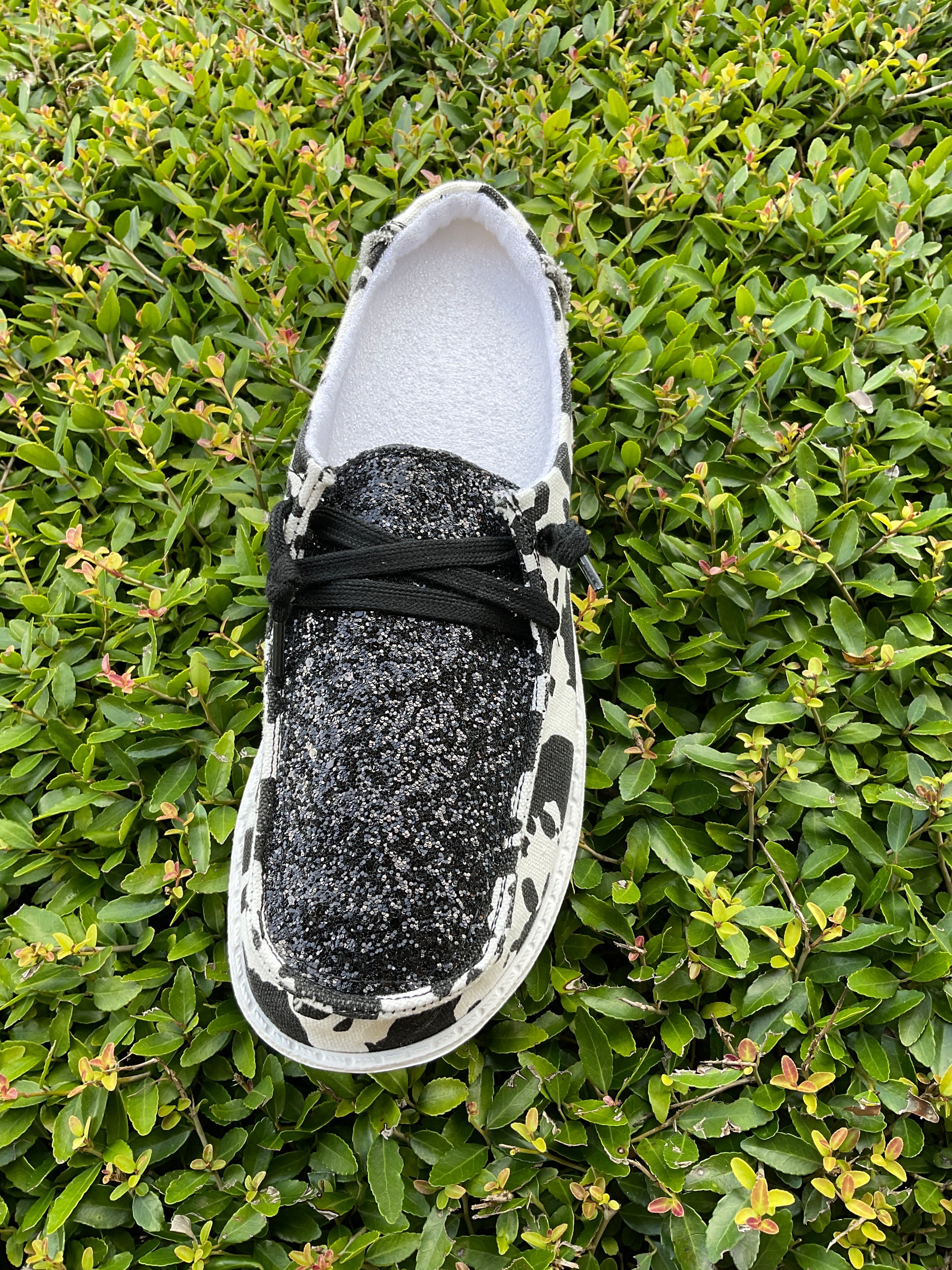 Gypsy Jazz style slip on shoes featuring cow print canvas with a black glitter insert on the top of the foot