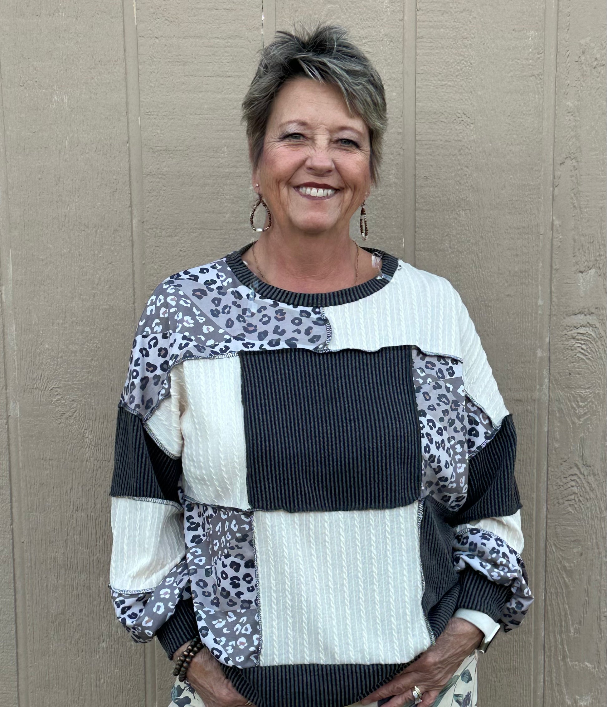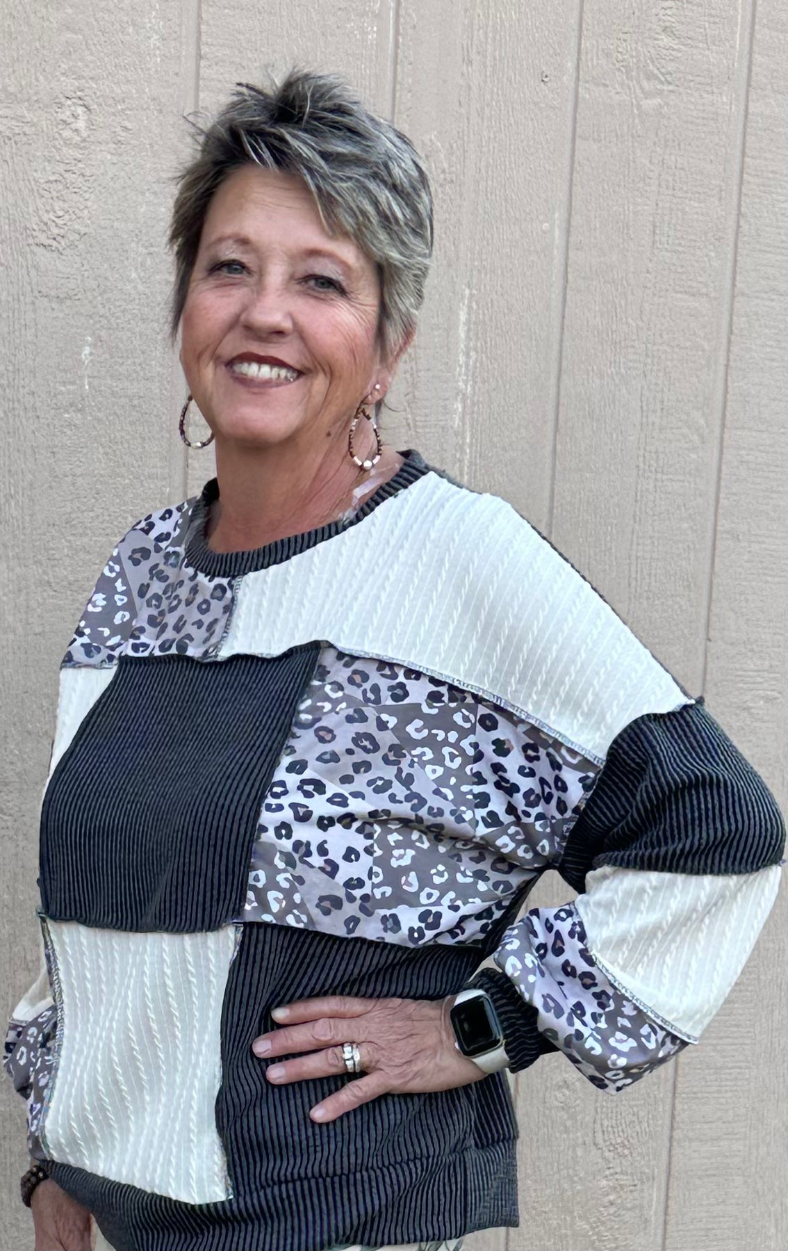 Mixed media top mixes rib cable, leopard print, and French Terry materials into an oversized fit