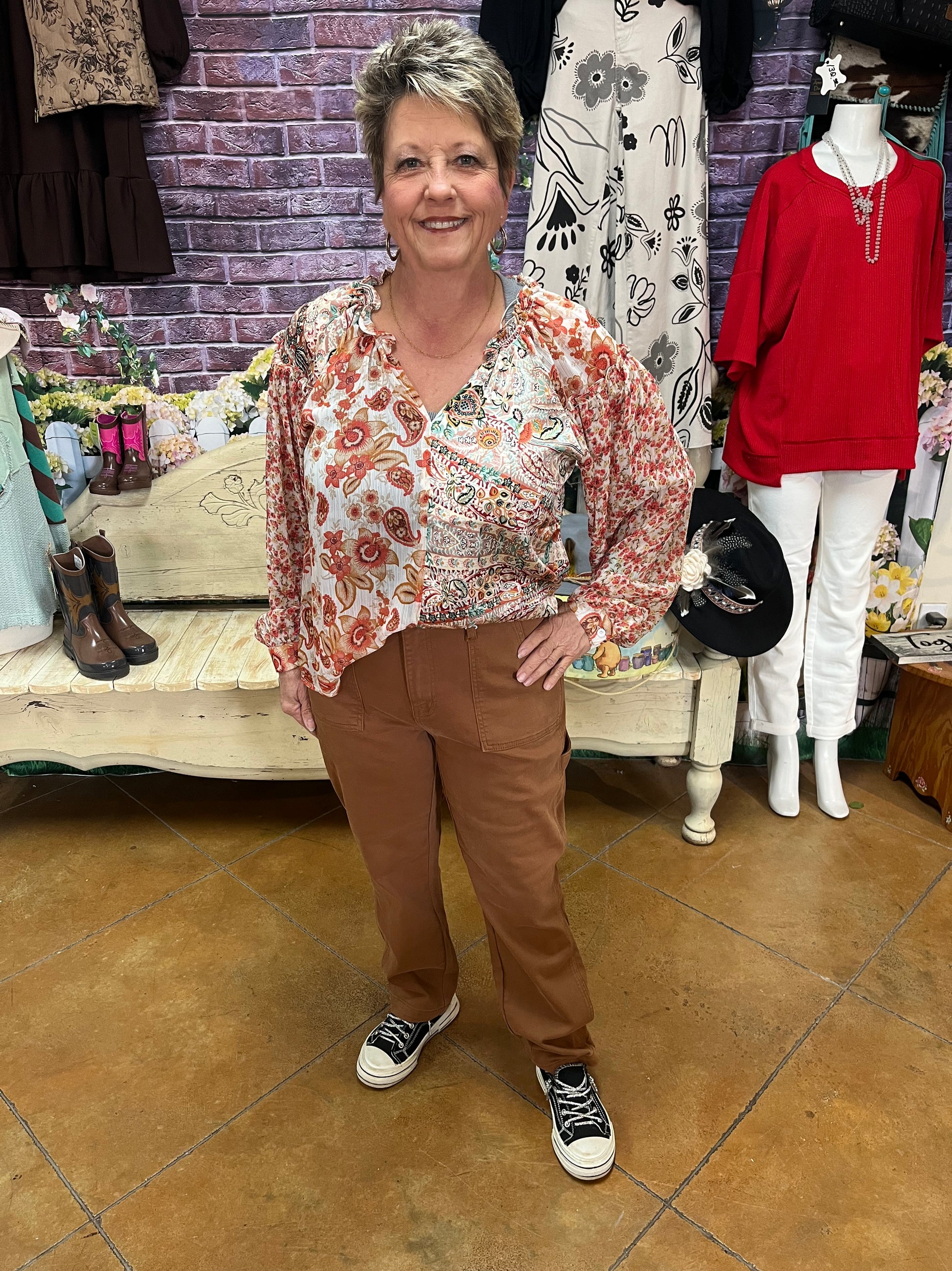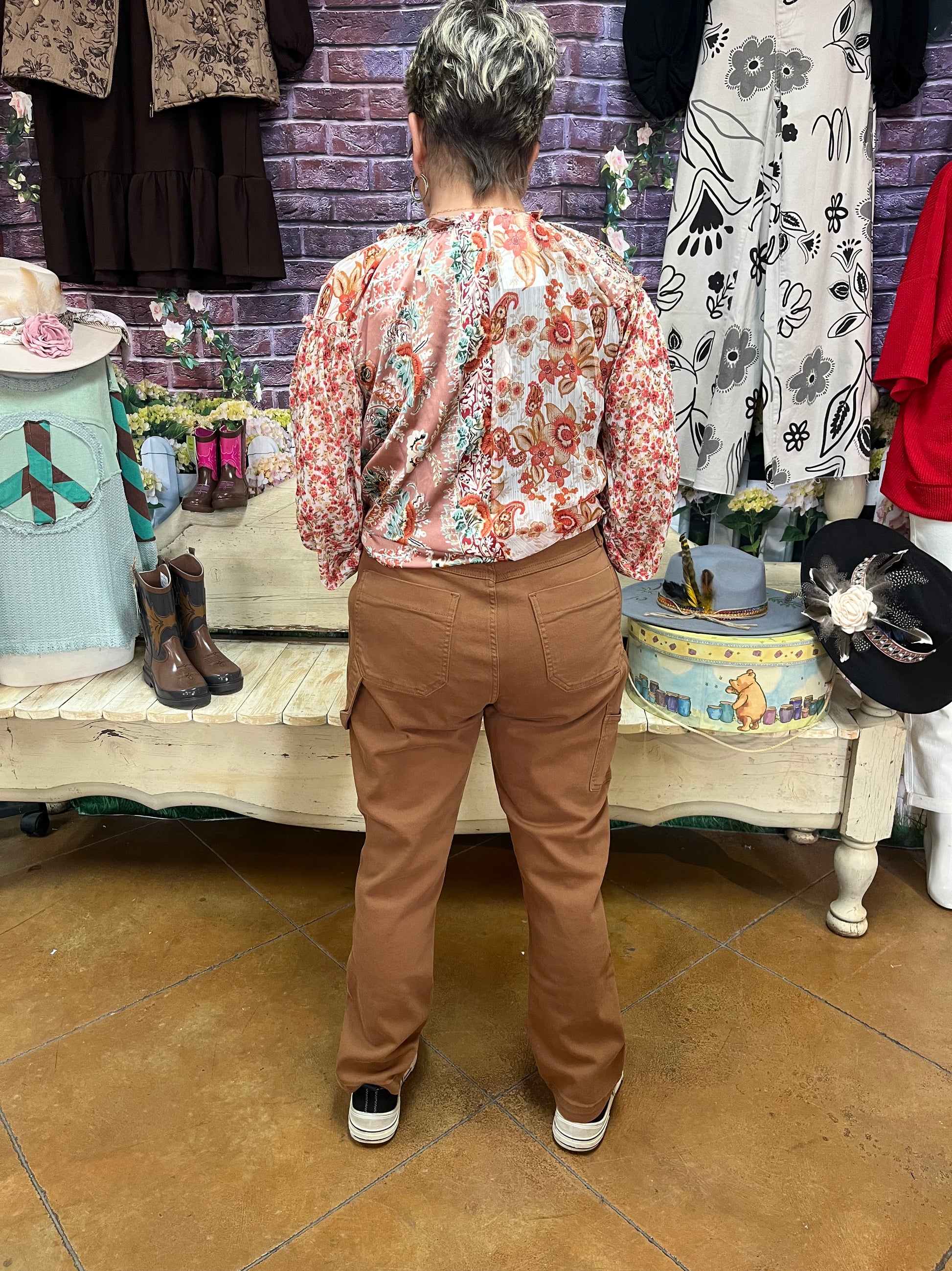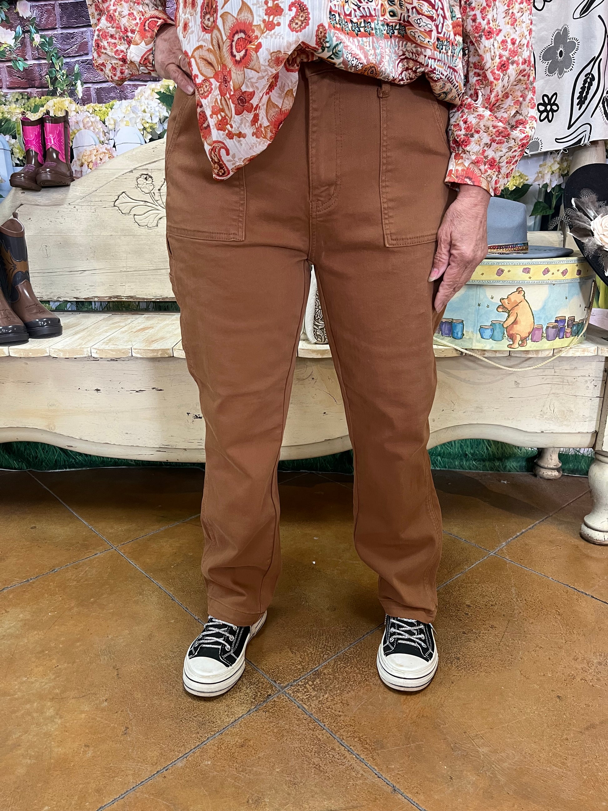Judy Blue Dyed Slim Fit Jeans. These are high waisted and are a camel colored denim. Has long front pockets and side pockets on the side of the leg.