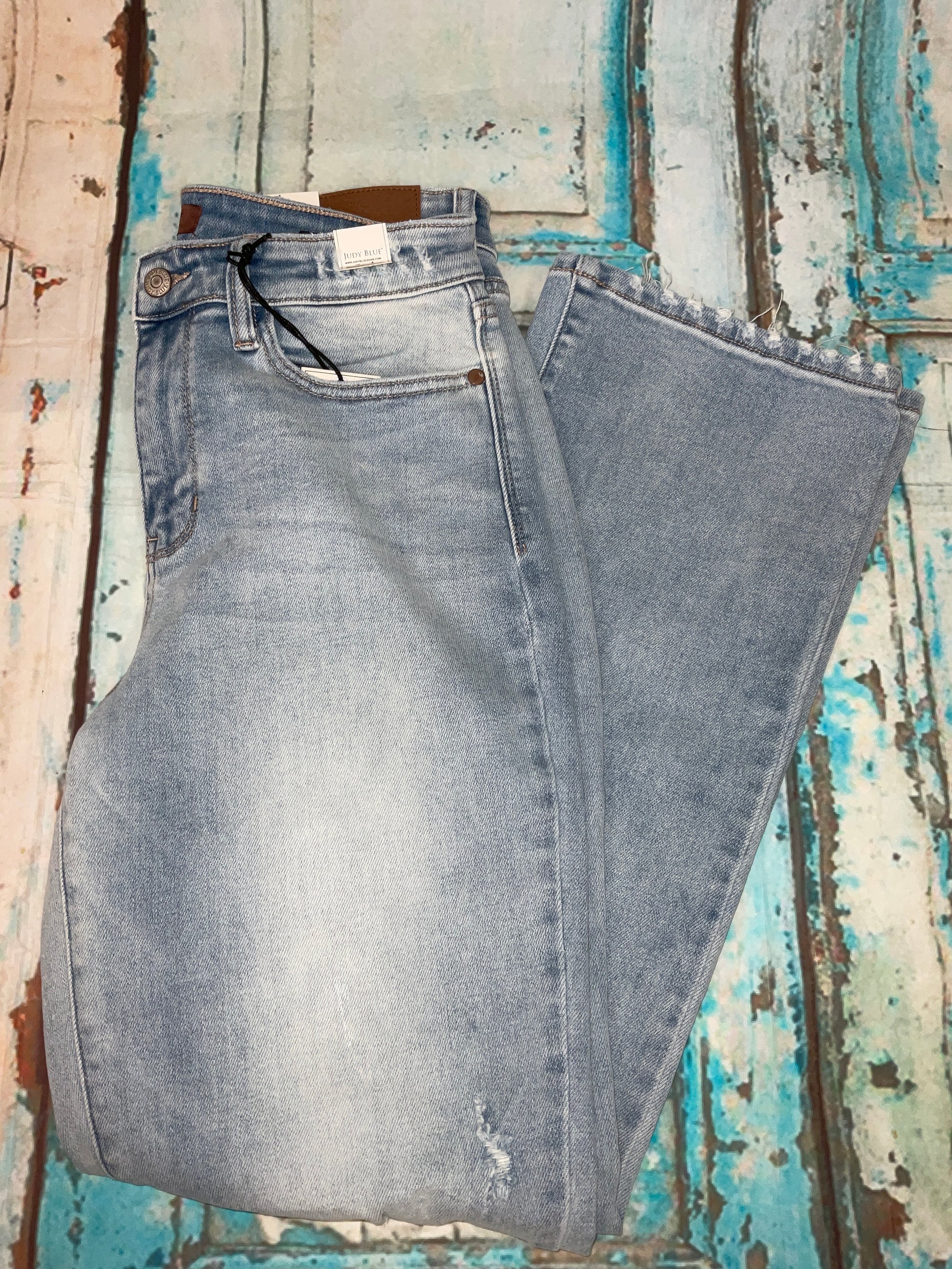 Judy Blue Style#82600 straight fit denim features distressed knees and a straight fit through hips and thighs in a light denim wash
