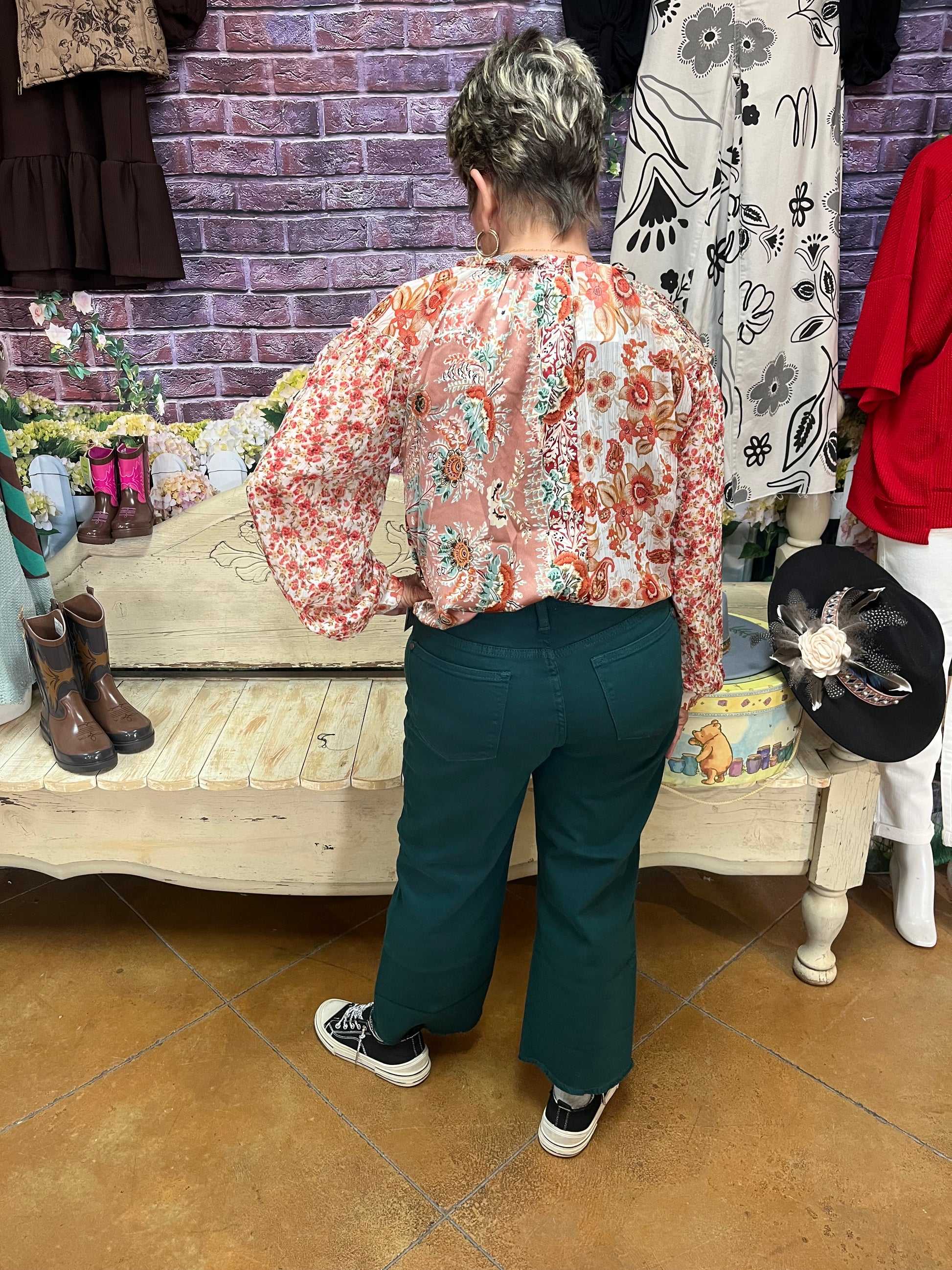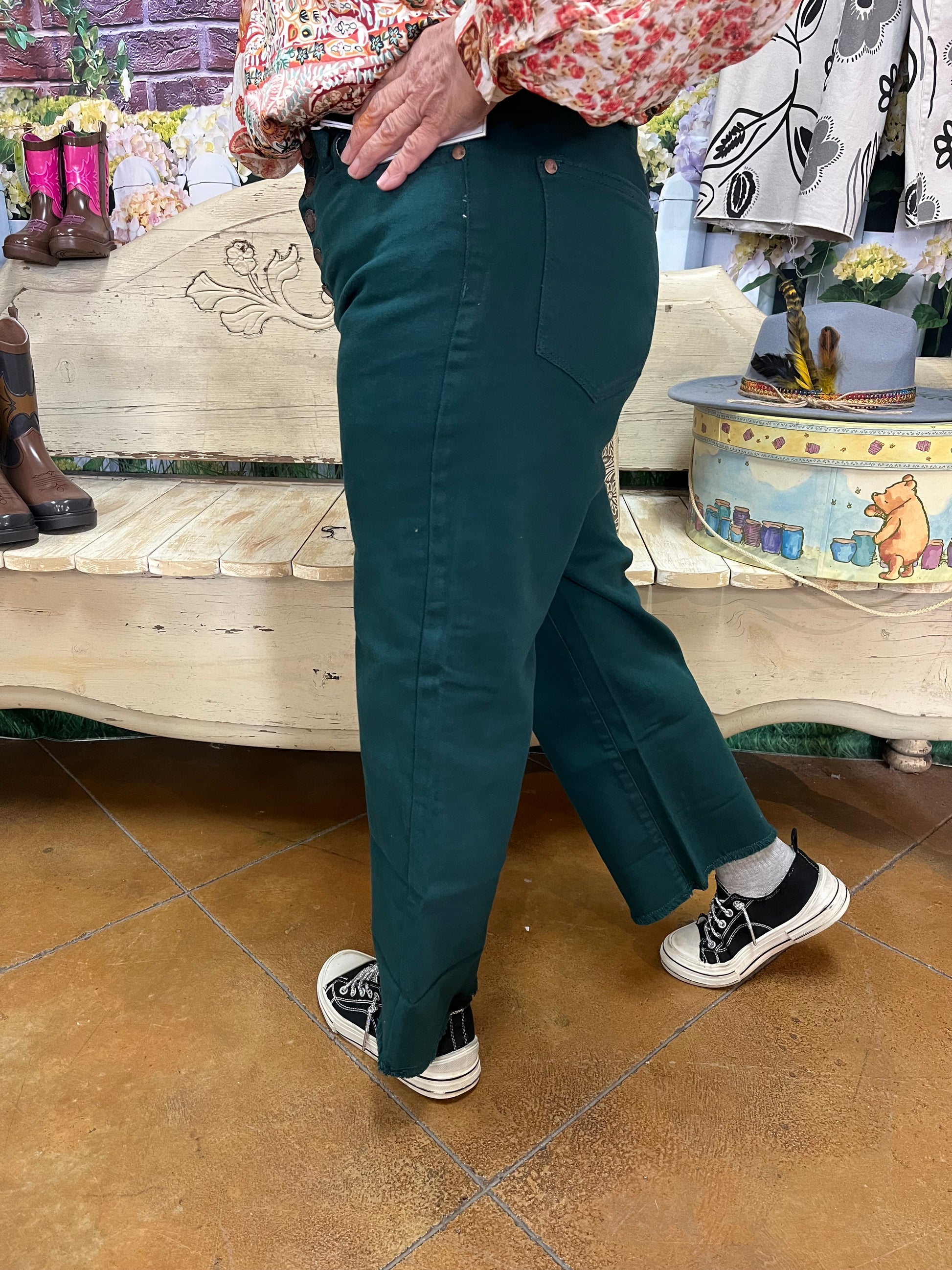 Judy Blue Emerald Green High Waisted Wide Leg Crops. These feature a button fly and have a 24” inseam.