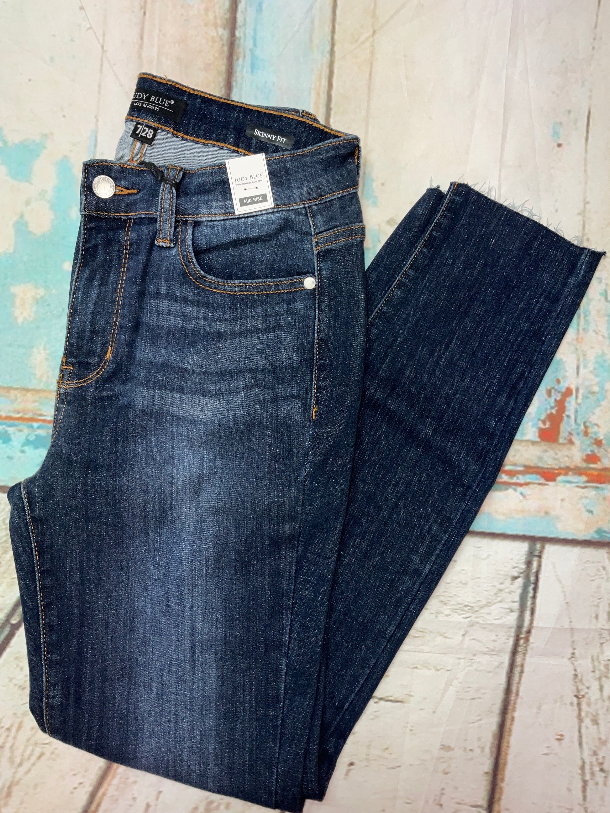 Judy Blues denim style#82201 skinny fit features a mid-rise waist, skinny fit through hips and thighs on non-distressed denim and a raw hem