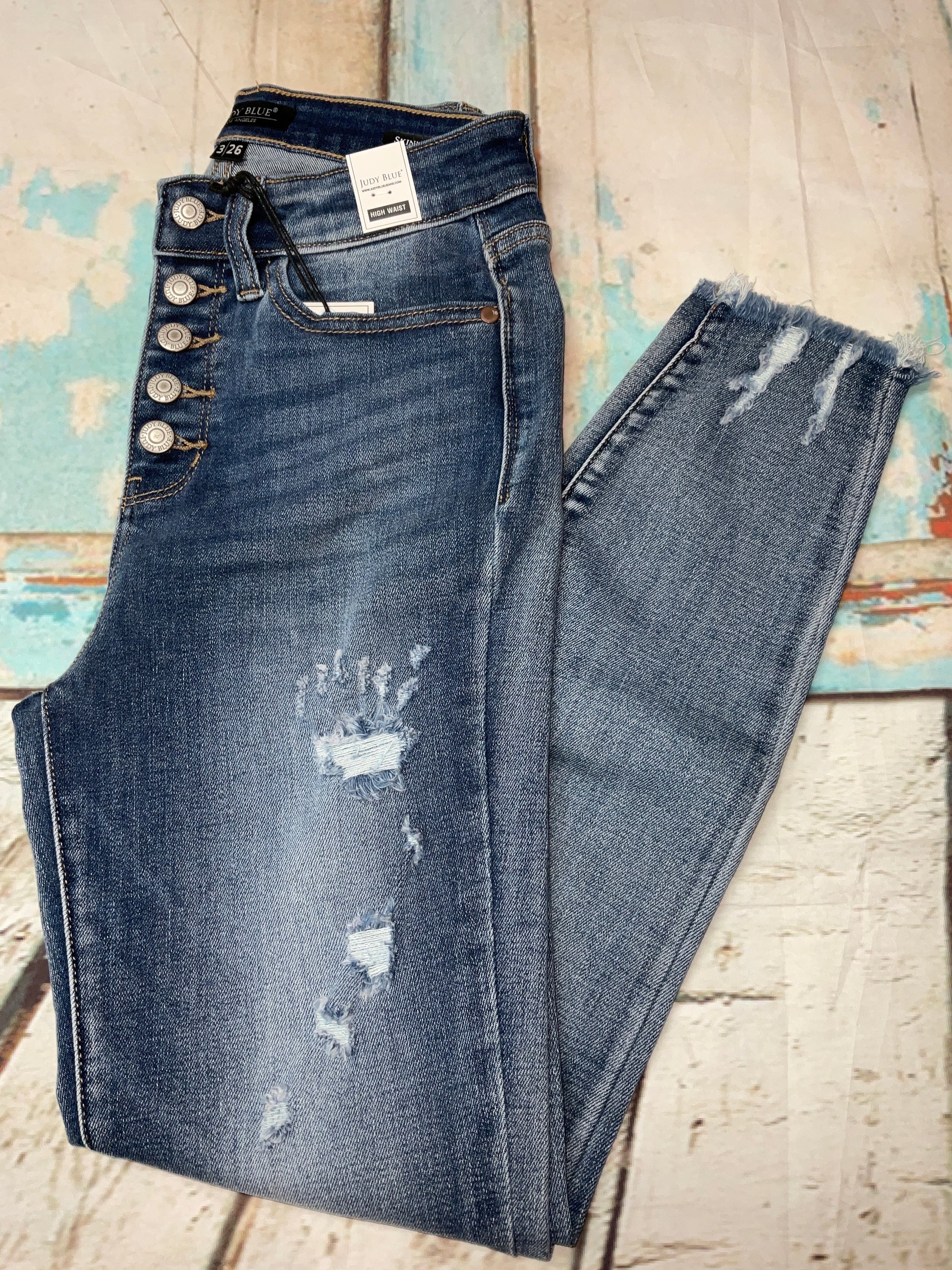Judy Blues denim style#82263 skinny fit featuring a button fly, high waist, slight distressed denim with a skinny fit through hips and thighs and a tapered leg with a raw hem