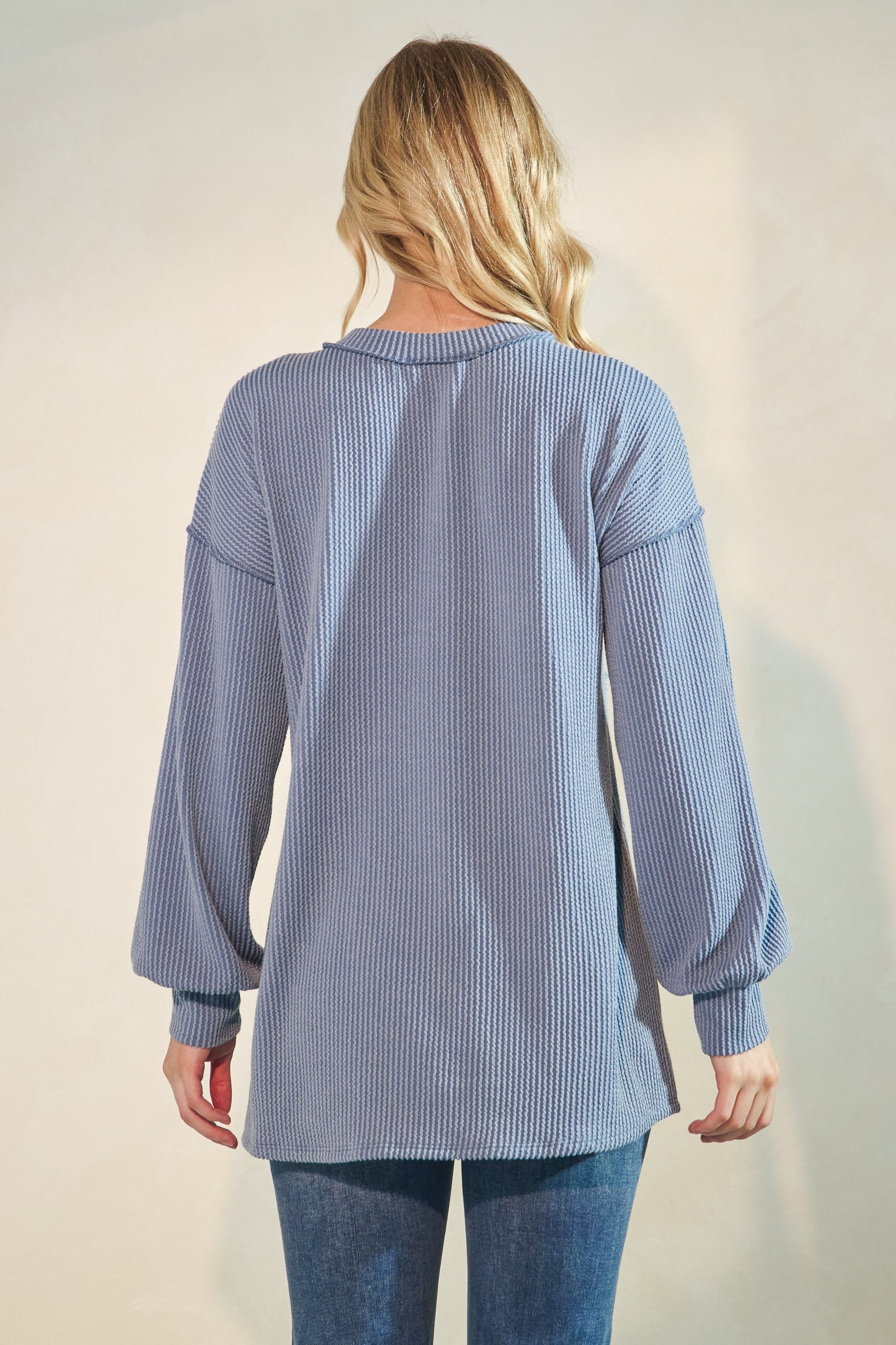 LONG PUFF SLEEVE ROUND NECK SOLID URBAN RIB TOP WITH BUTTERFLY PATCH