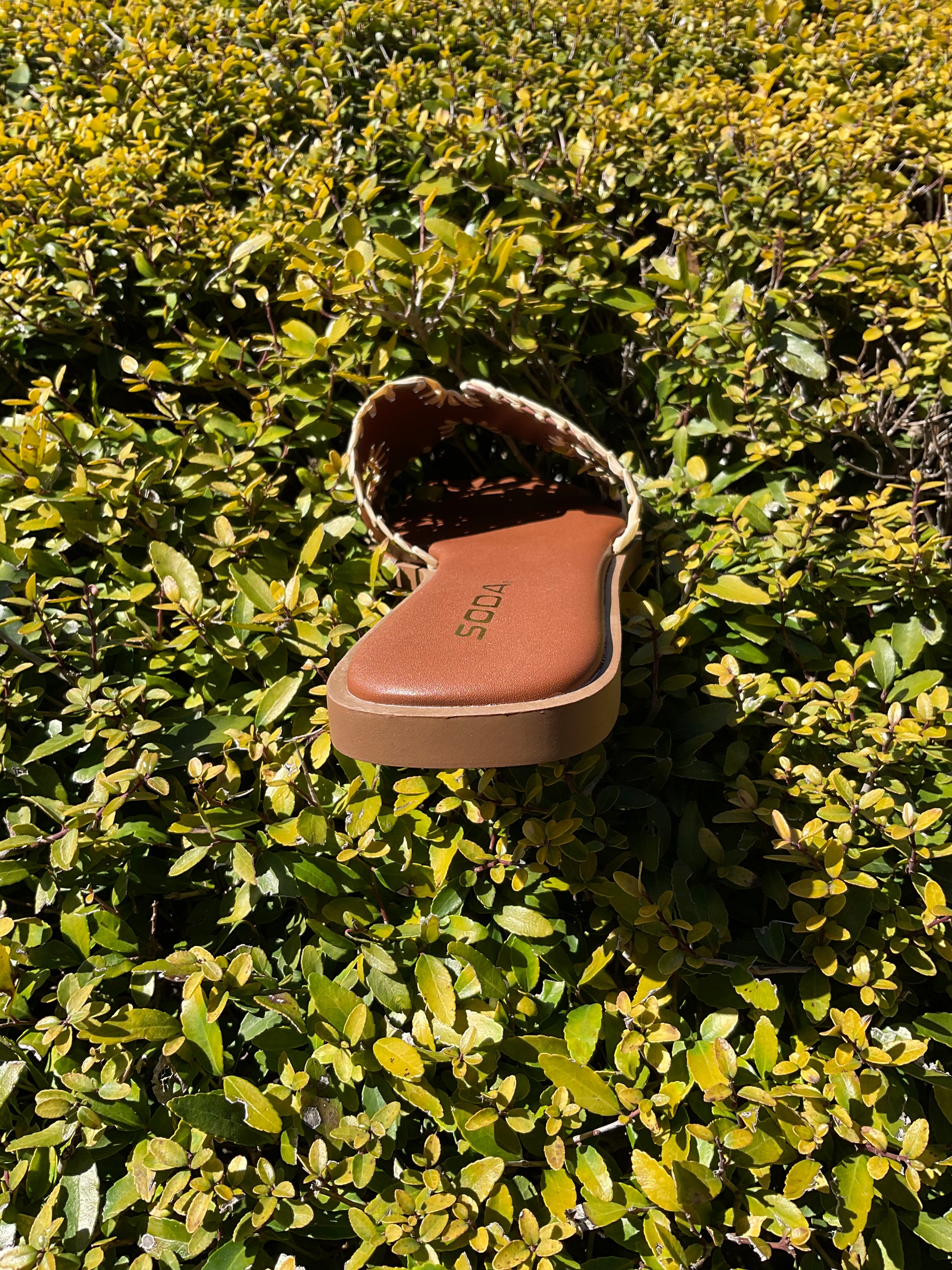 Soda brand sandals features a flat heel and decorative brown leather upper with tan colored stitching.