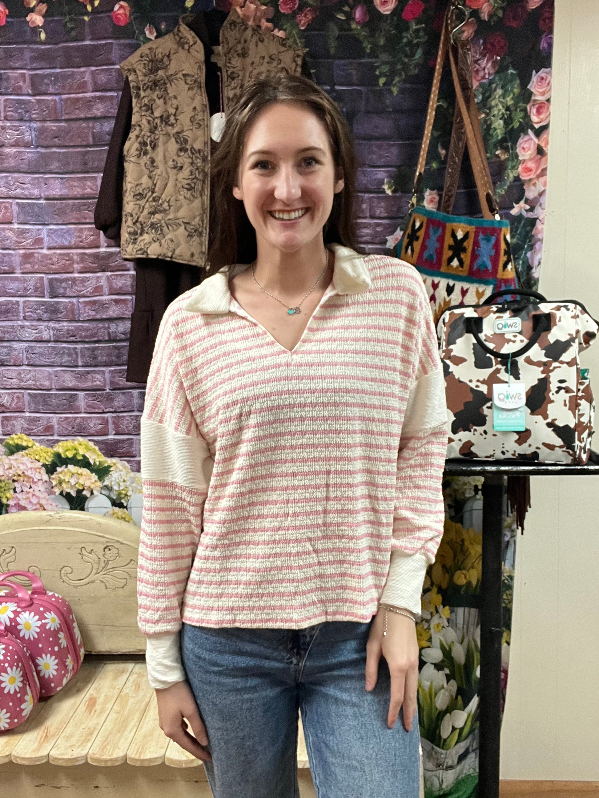 This is a textured long sleeve top with a collar! Striped pattern, material is 50% cotton, 43% polyester, and 7% spandex