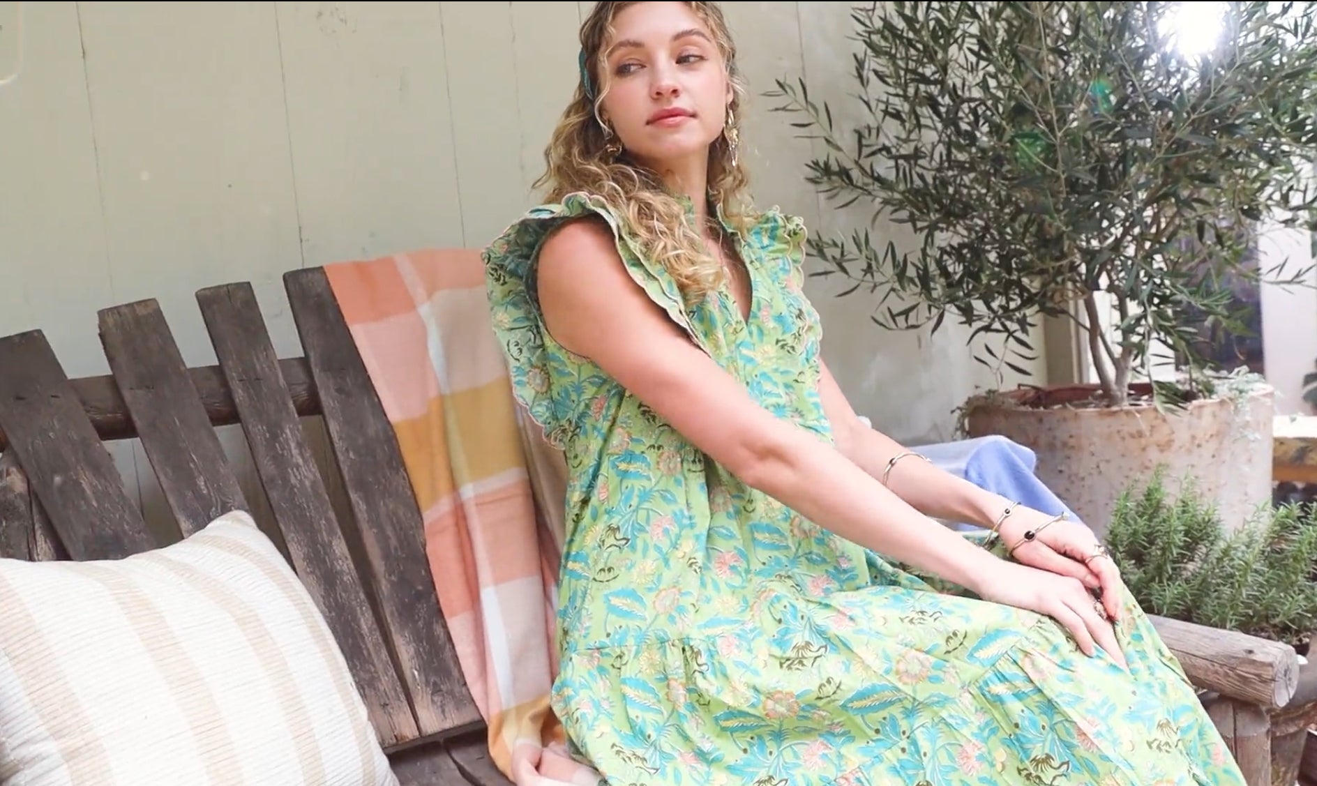 Midi length Umgee ruffle sleeve dress with a pretty sage green mix floral print
