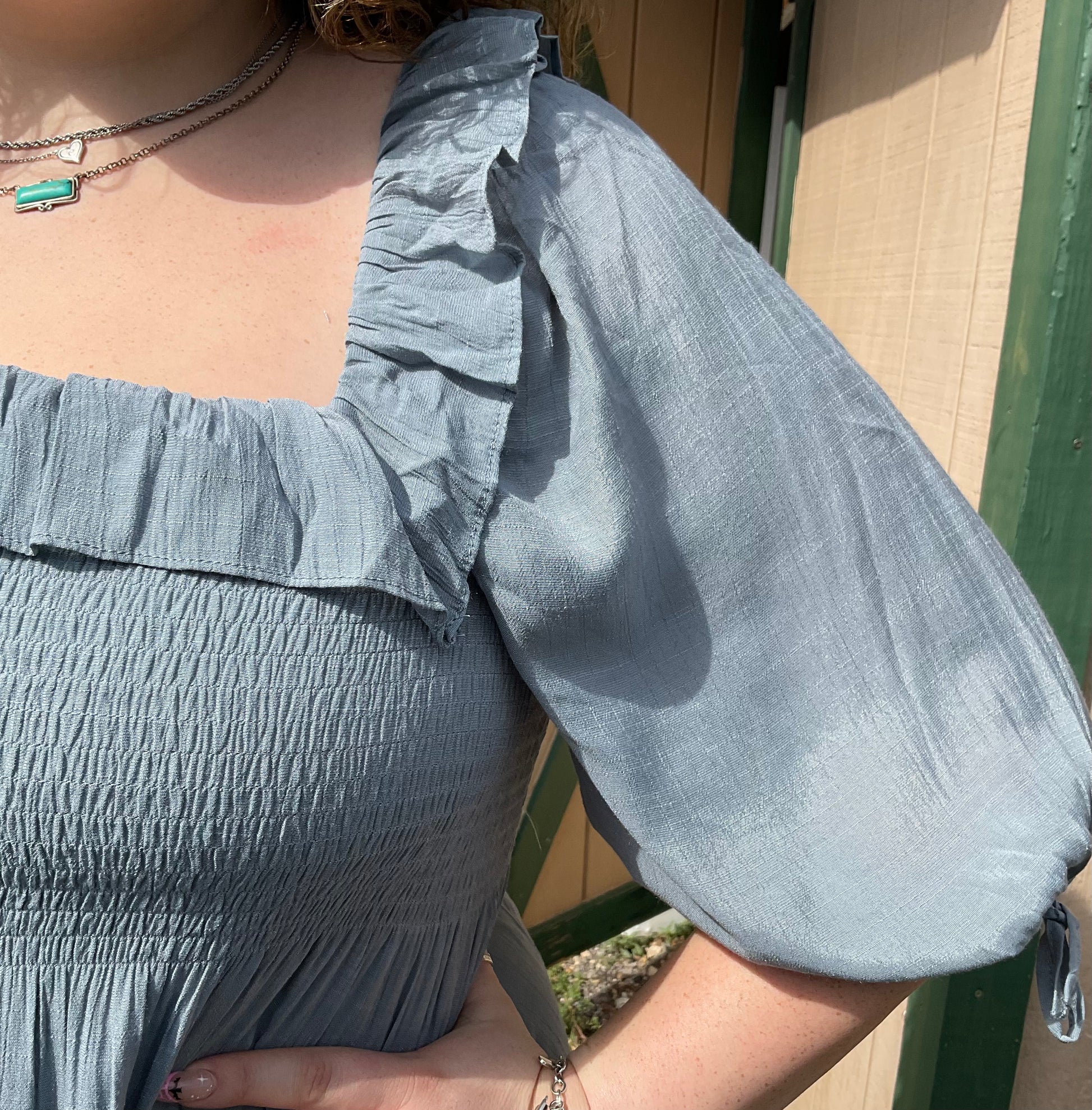 Wishlist brand tiered midi dress with ruffled detail. Dress features a smocked bodice with self sleeve ties. 100% polyester