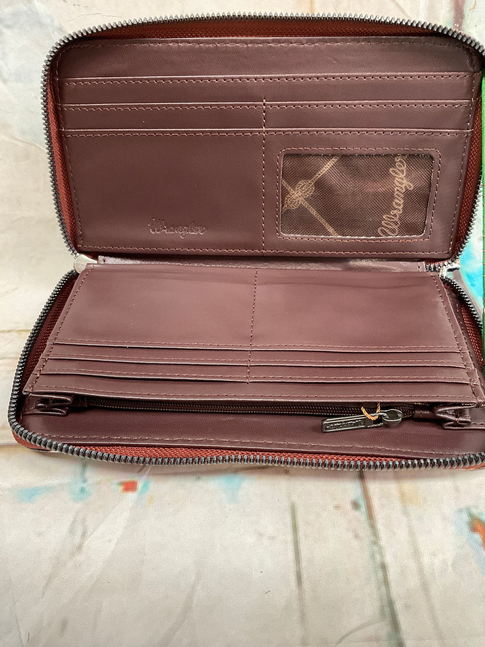 Wrangler brand leather cow print wristlets featuring braided decoration, a small wrist band. Inside features leather credit card slots, a zippered coin pocket and several pockets for various items.